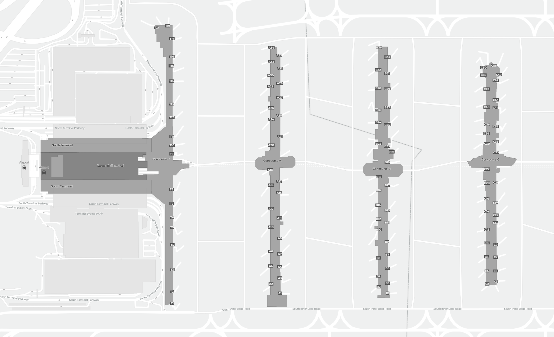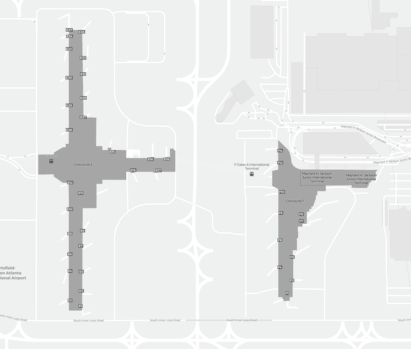 Il s’agit d’une carte zoomable sur Atlanta (ATL). La carte peut vous donner un aperçu de la zone extérieure avec les terminaux, parkings, et dans certains aéroports aussi des détails sur les portes, les agences de location de voitures et autres commodités si vous zoomez.