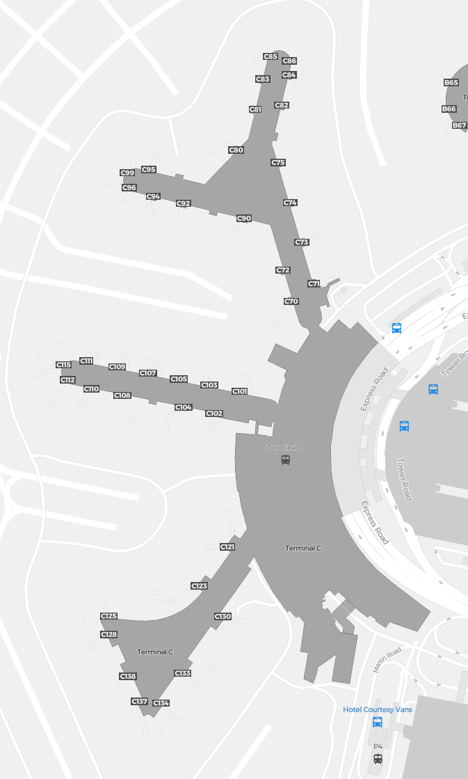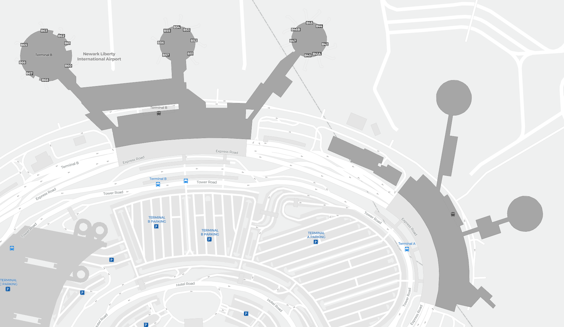 Il s’agit d’une carte zoomable sur Newark (EWR). La carte peut vous donner un aperçu de la zone extérieure avec les terminaux, parkings, et dans certains aéroports aussi des détails sur les portes, les agences de location de voitures et autres commodités si vous zoomez.
