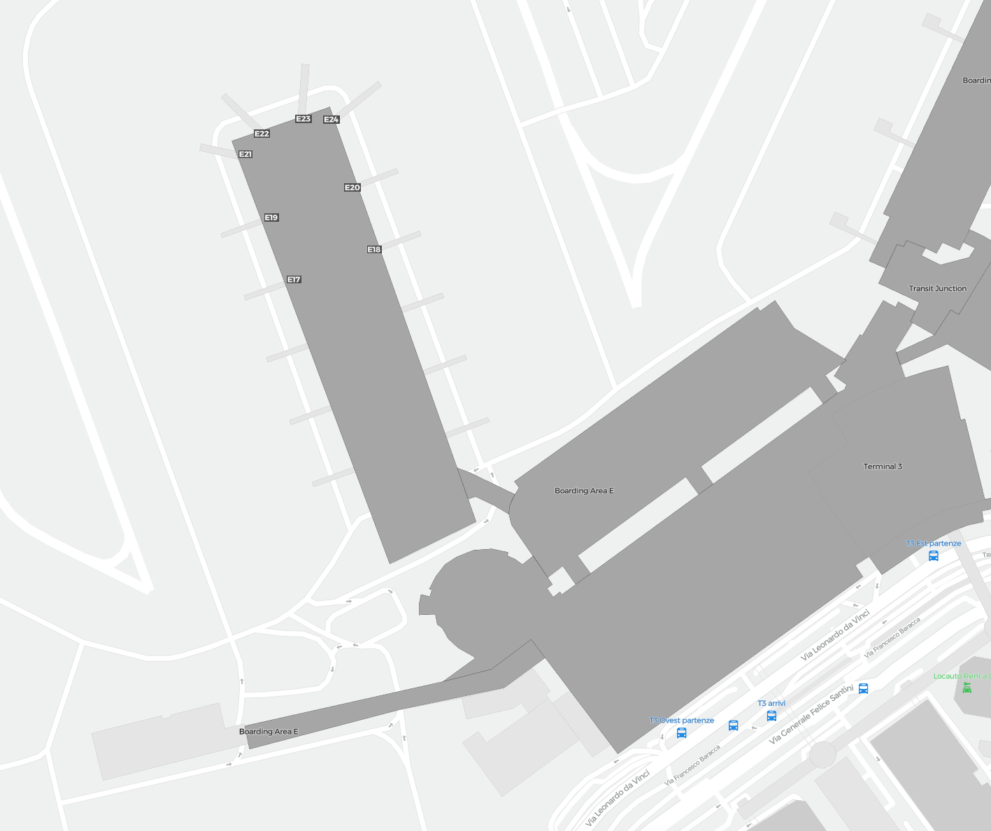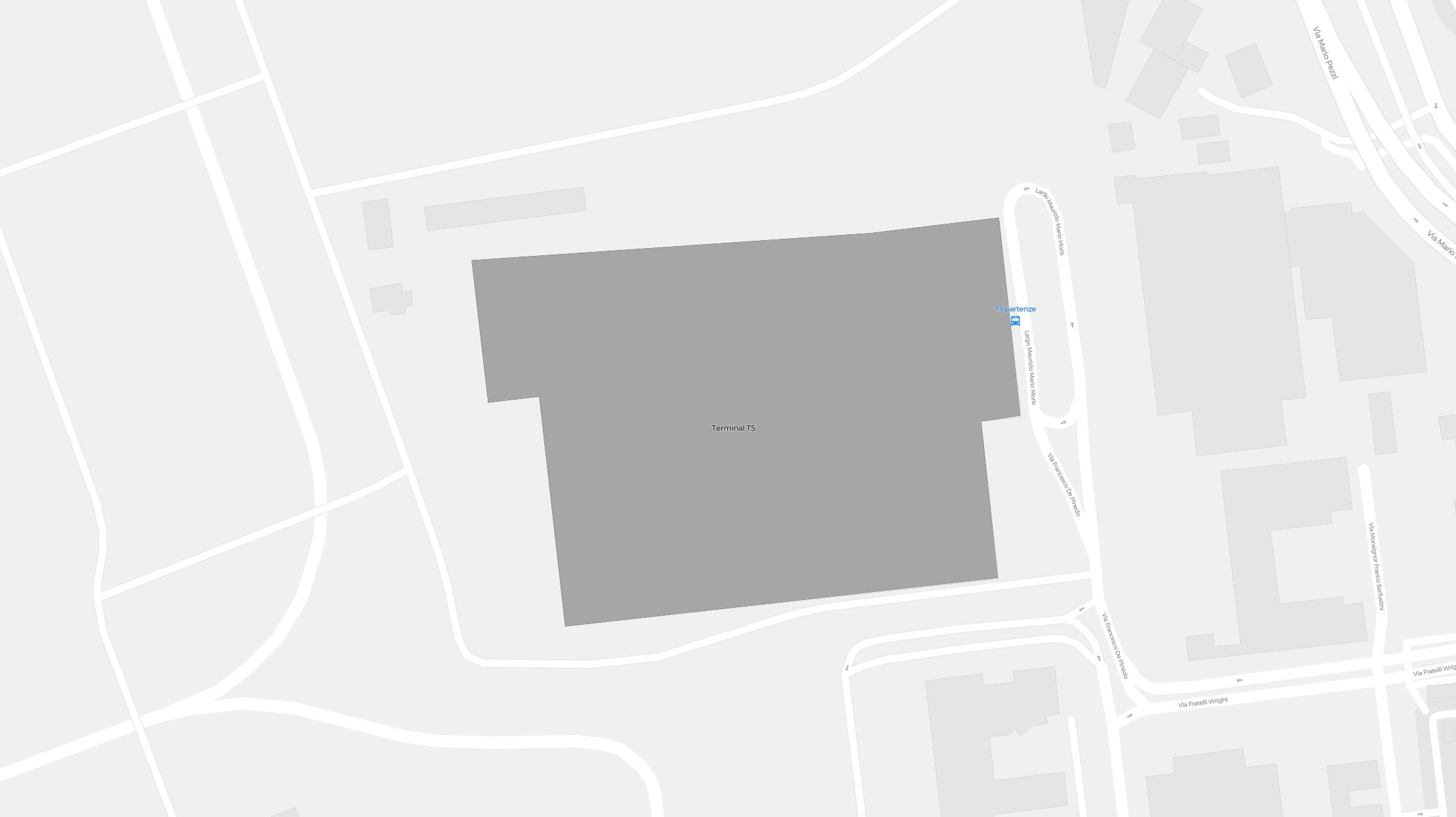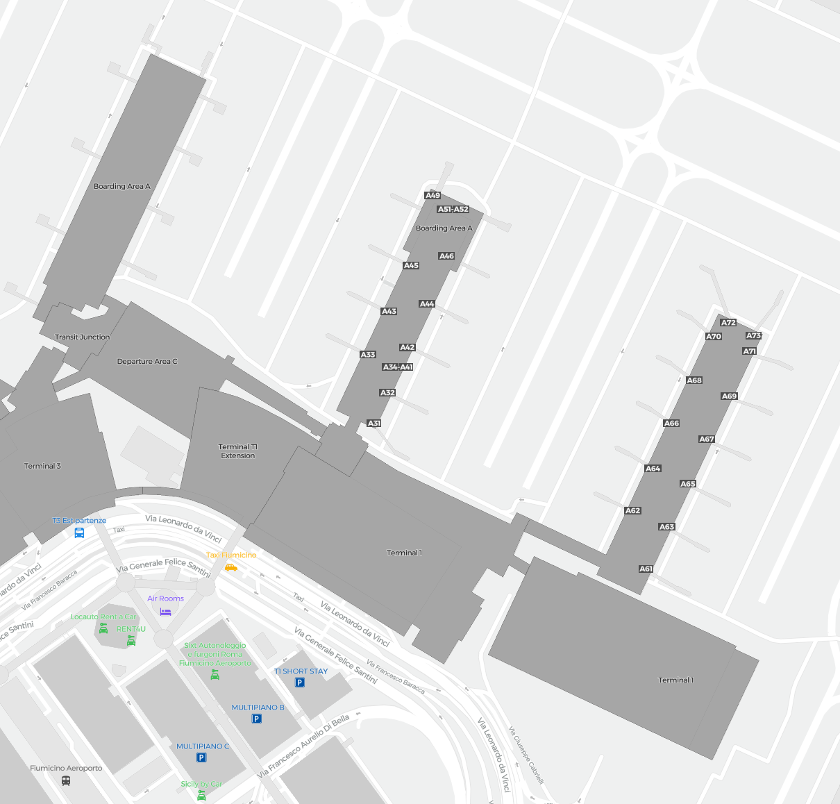 Il s’agit d’une carte zoomable sur Rome (FCO). La carte peut vous donner un aperçu de la zone extérieure avec les terminaux, parkings, et dans certains aéroports aussi des détails sur les portes, les agences de location de voitures et autres commodités si vous zoomez.