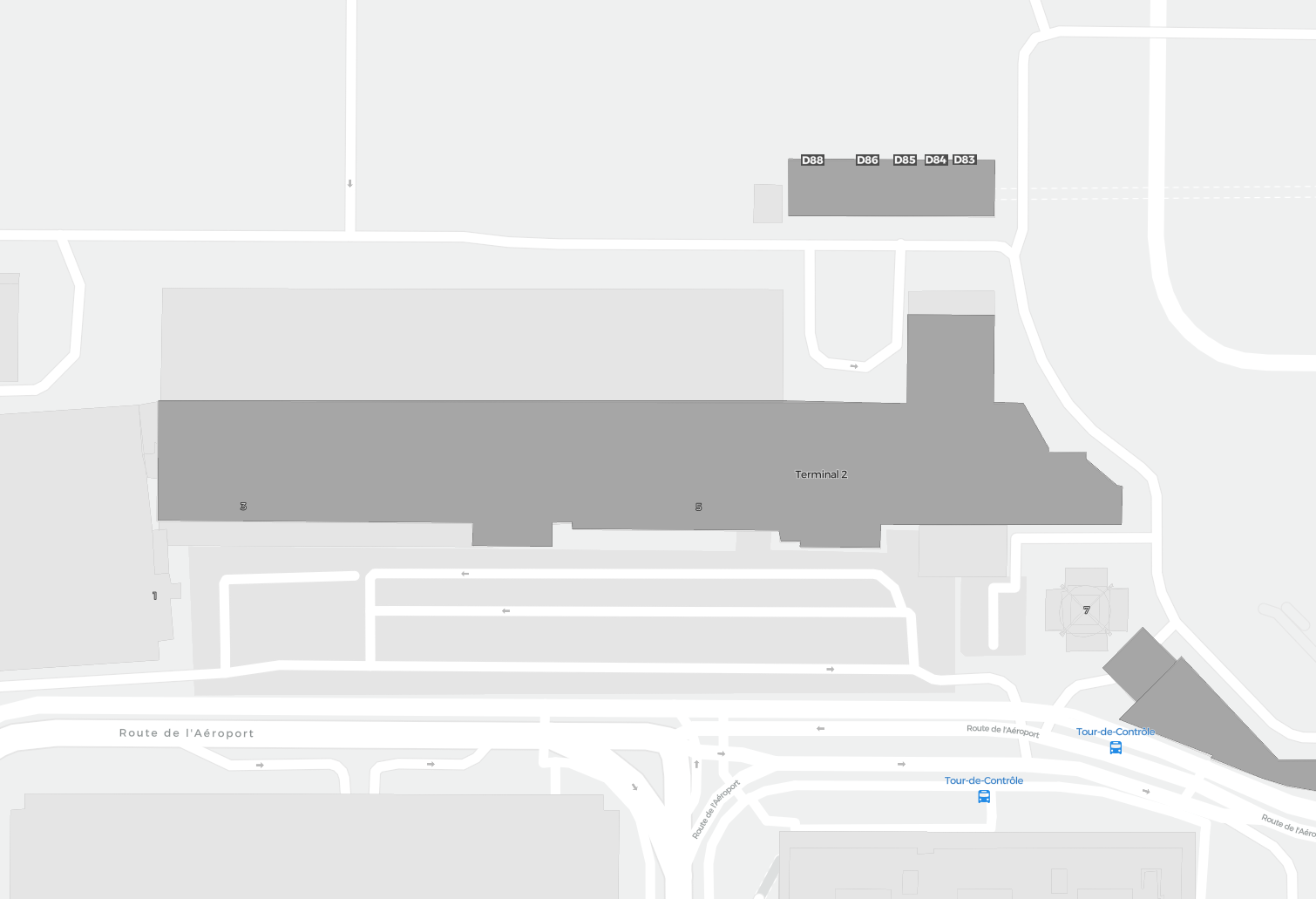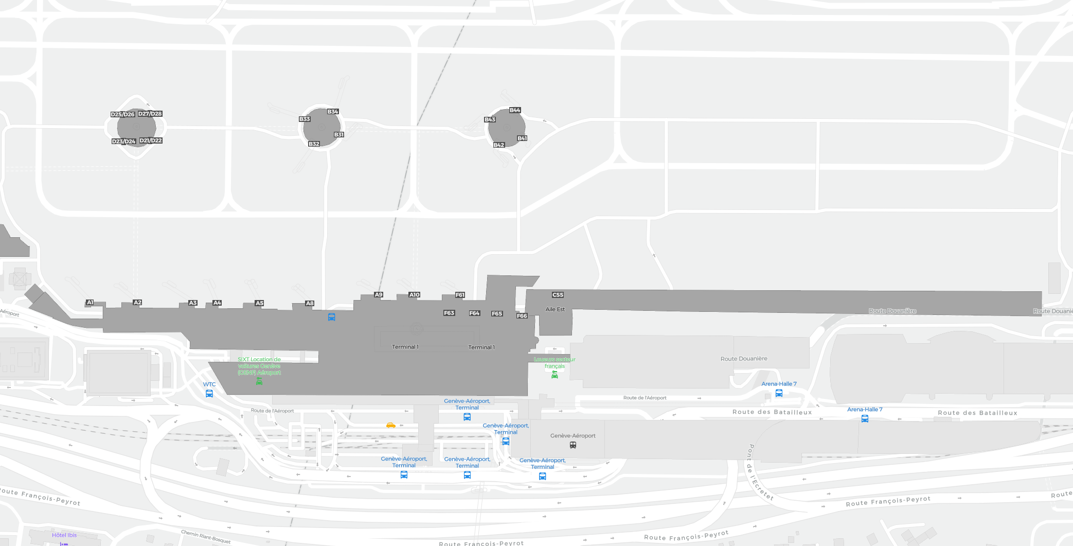 Il s’agit d’une carte zoomable sur Genève (GVA). La carte peut vous donner un aperçu de la zone extérieure avec les terminaux, parkings, et dans certains aéroports aussi des détails sur les portes, les agences de location de voitures et autres commodités si vous zoomez.