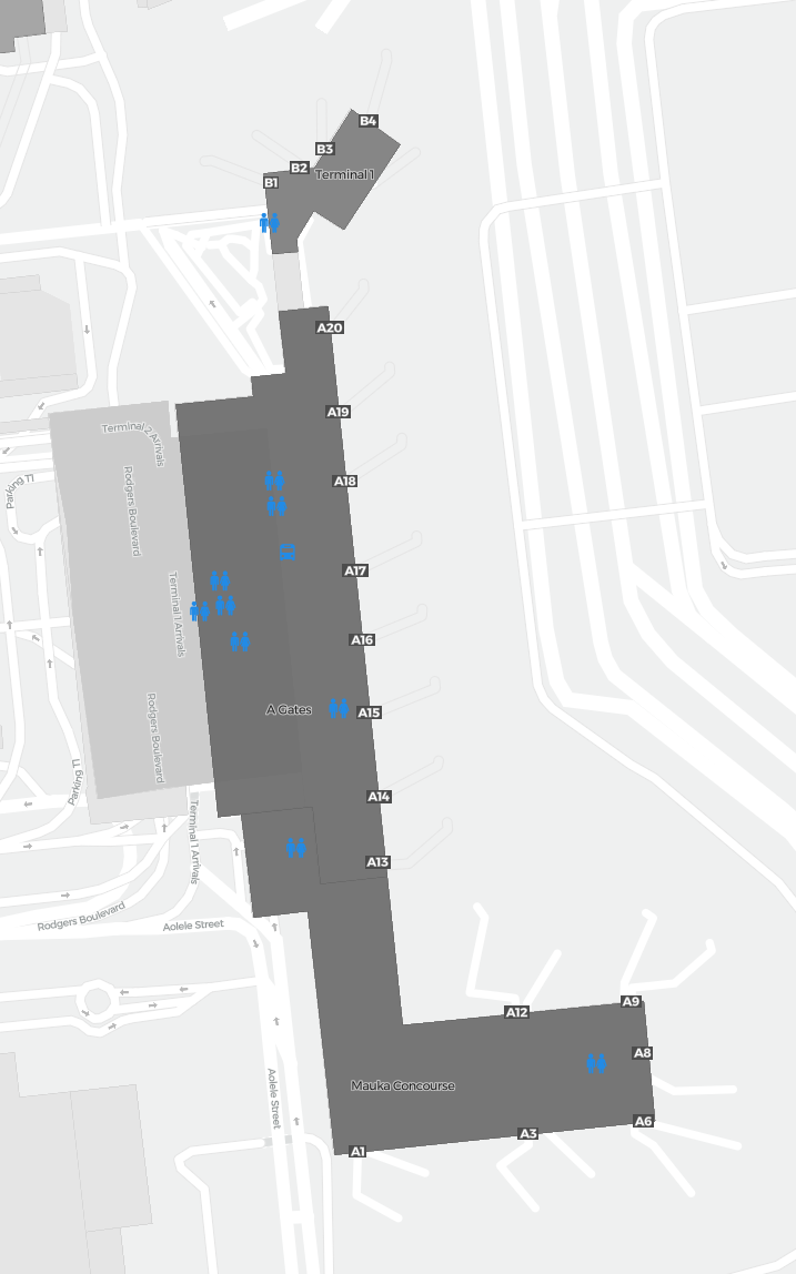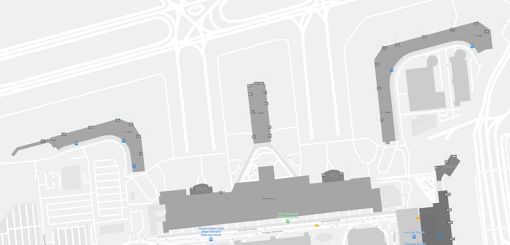 Il s’agit d’une carte zoomable sur Honolulu (HNL). La carte peut vous donner un aperçu de la zone extérieure avec les terminaux, parkings, et dans certains aéroports aussi des détails sur les portes, les agences de location de voitures et autres commodités si vous zoomez.