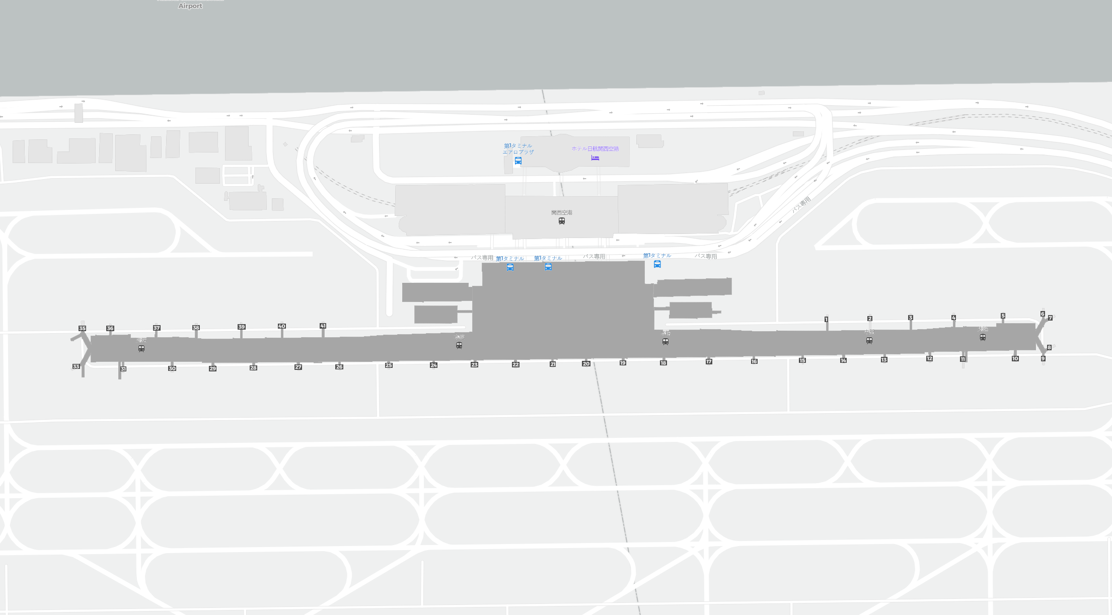 Il s’agit d’une carte zoomable sur Osaka (KIX). La carte peut vous donner un aperçu de la zone extérieure avec les terminaux, parkings, et dans certains aéroports aussi des détails sur les portes, les agences de location de voitures et autres commodités si vous zoomez.