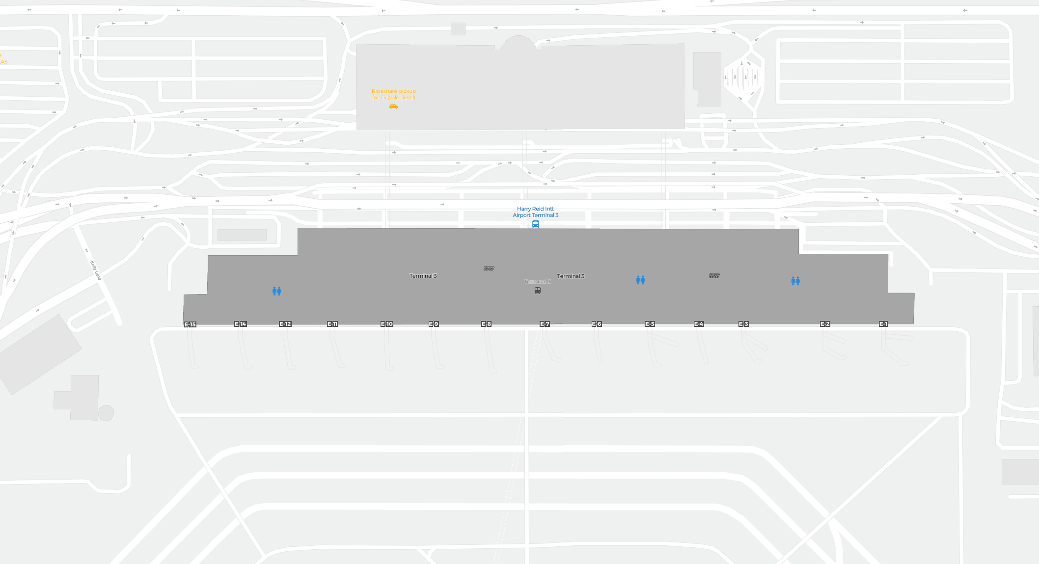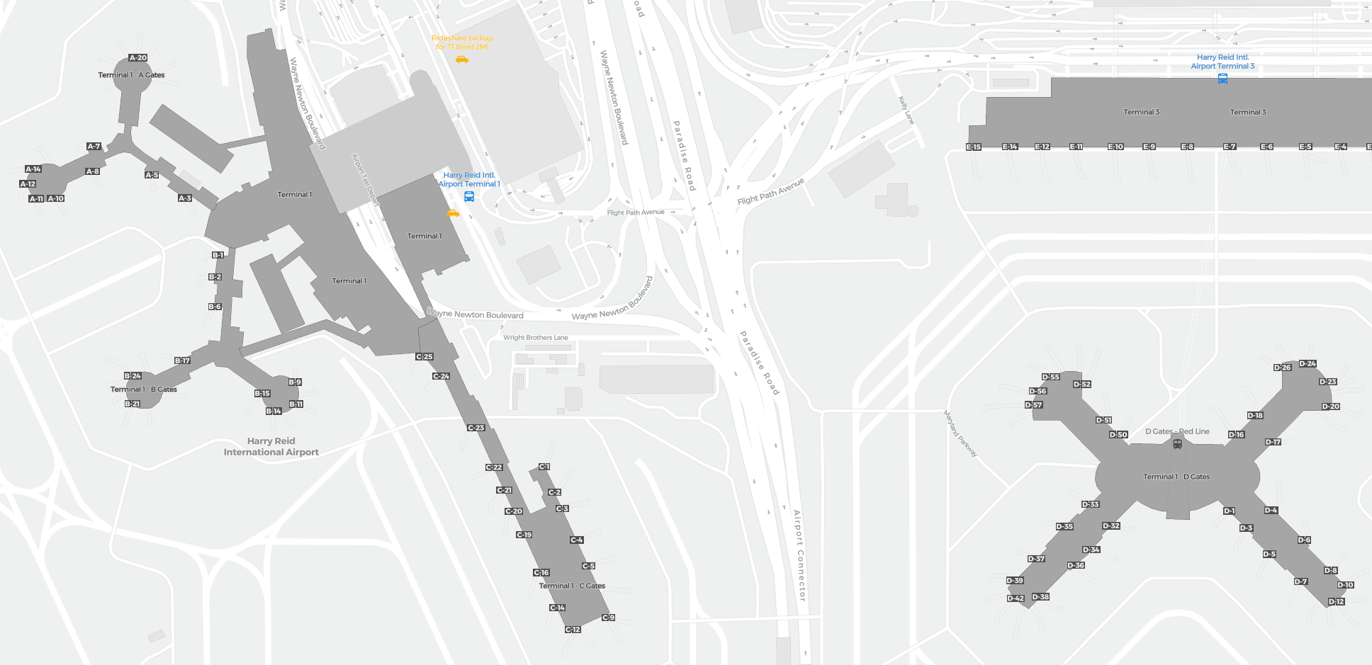 Il s’agit d’une carte zoomable sur Las Vegas (LAS). La carte peut vous donner un aperçu de la zone extérieure avec les terminaux, parkings, et dans certains aéroports aussi des détails sur les portes, les agences de location de voitures et autres commodités si vous zoomez.