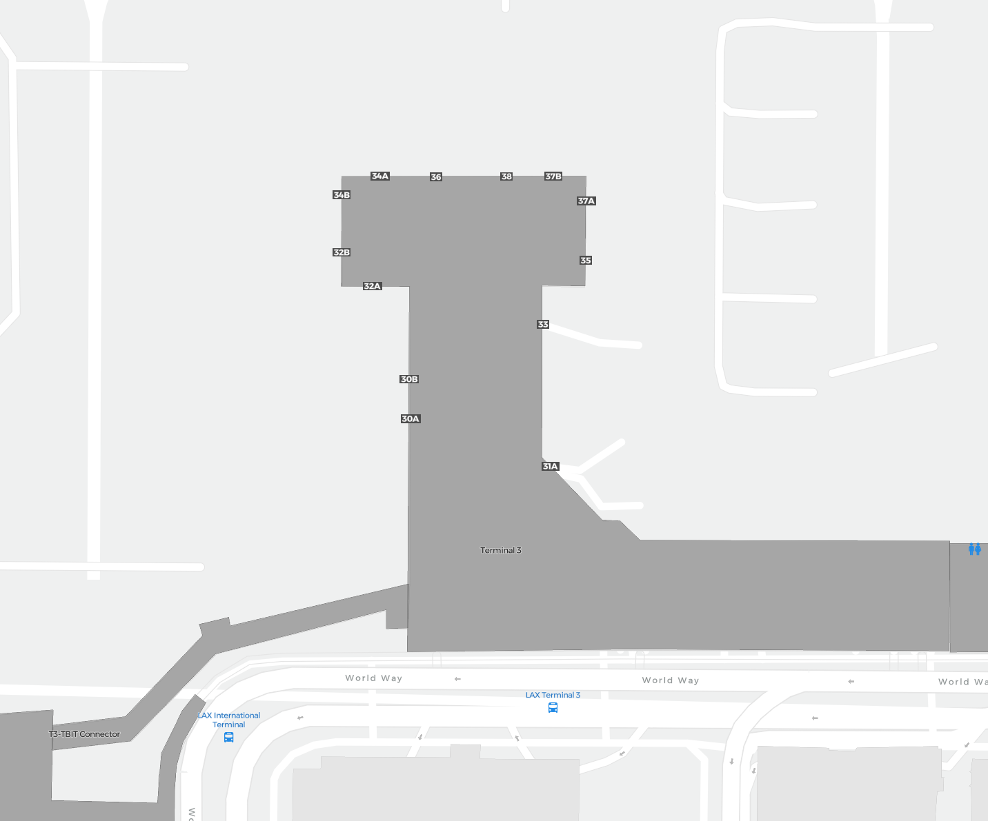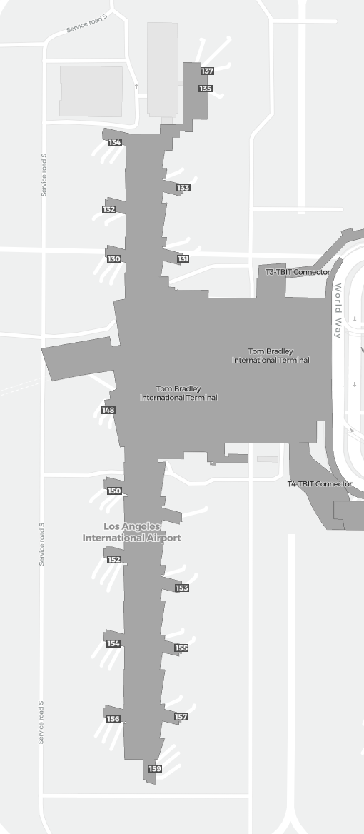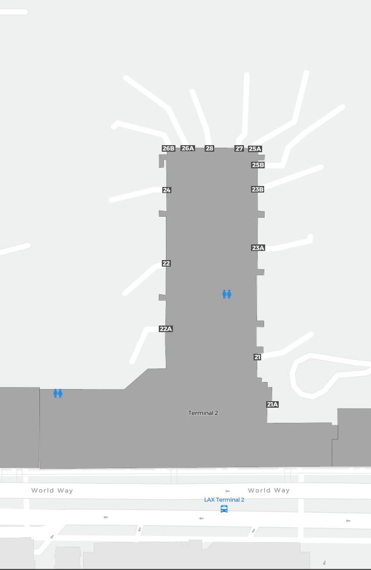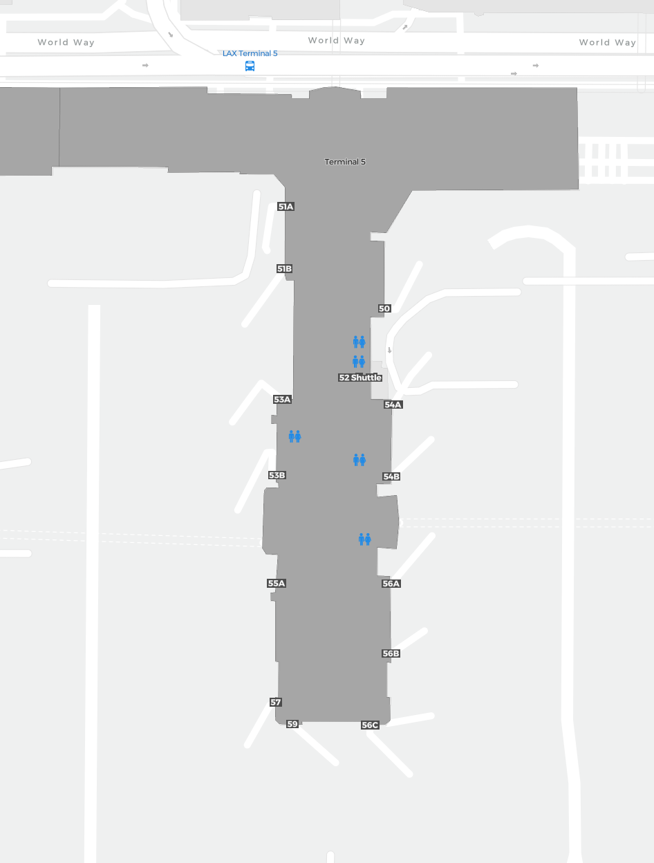 Il s’agit d’une carte zoomable sur Los Angeles (LAX). La carte peut vous donner un aperçu de la zone extérieure avec les terminaux, parkings, et dans certains aéroports aussi des détails sur les portes, les agences de location de voitures et autres commodités si vous zoomez.