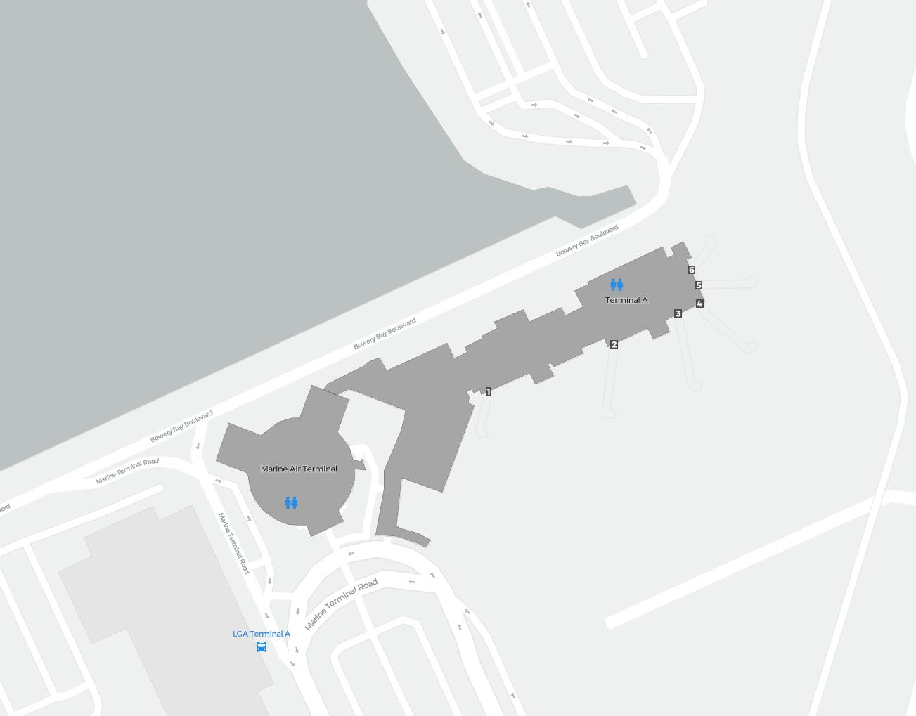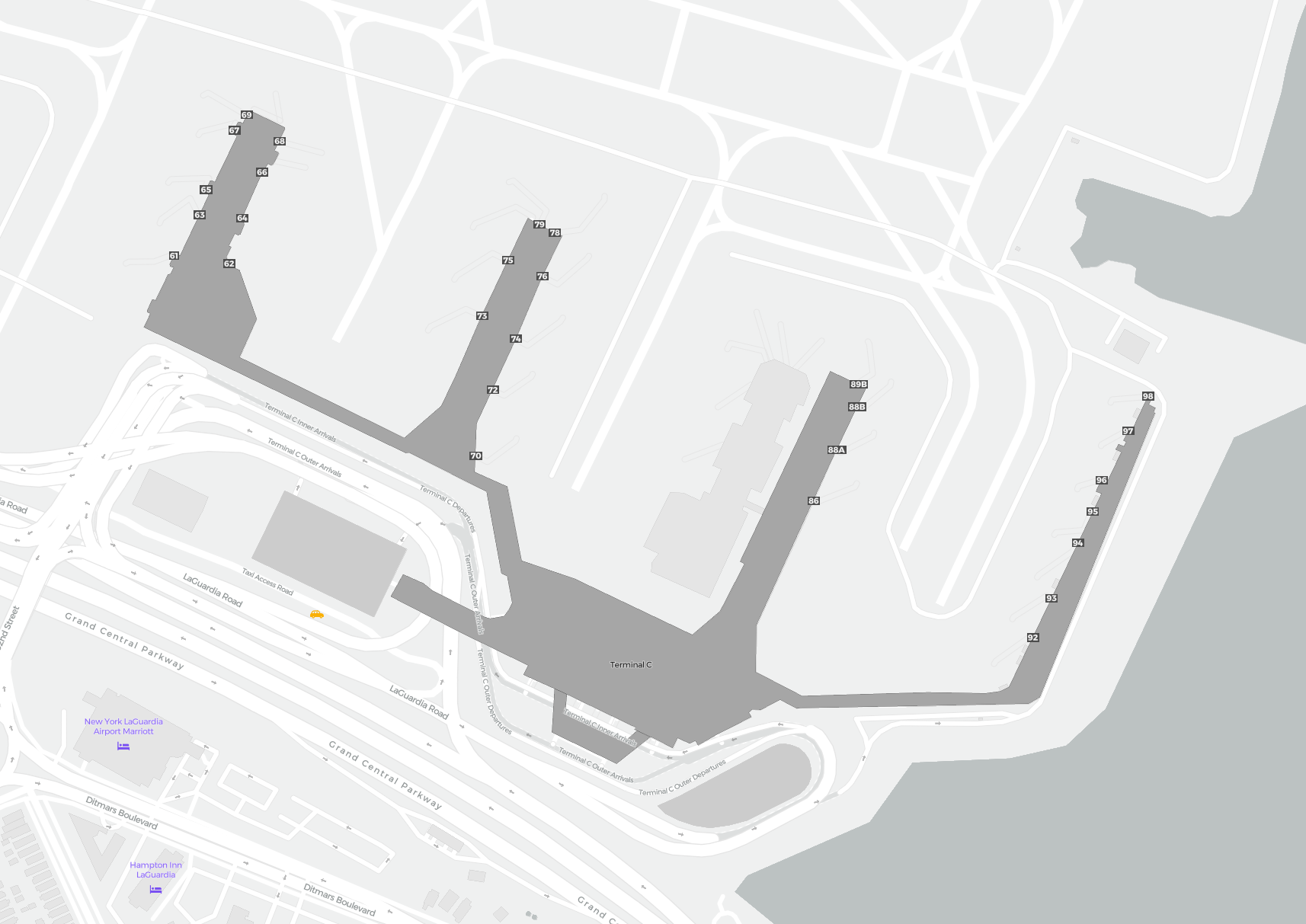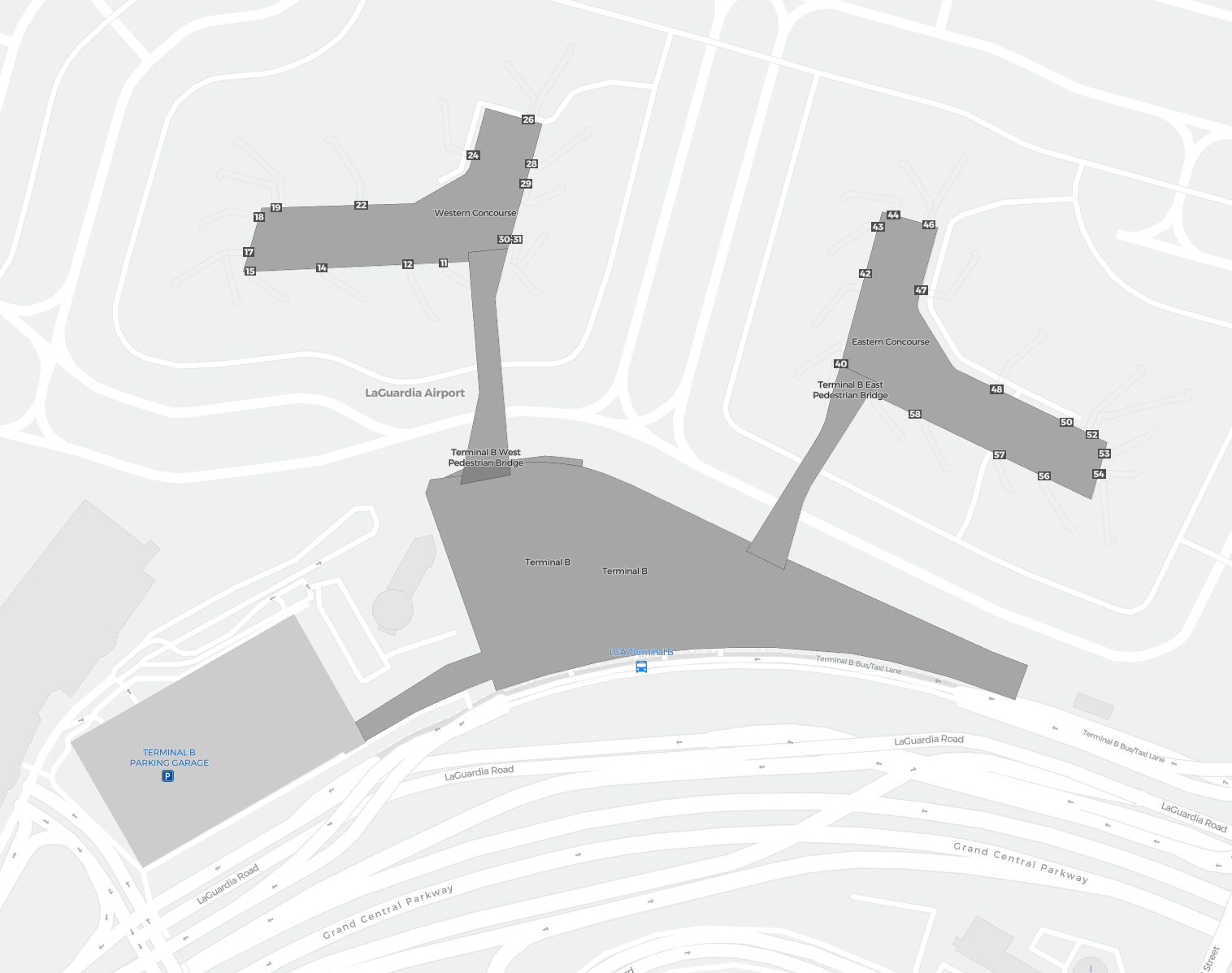Il s’agit d’une carte zoomable sur New York (LGA). La carte peut vous donner un aperçu de la zone extérieure avec les terminaux, parkings, et dans certains aéroports aussi des détails sur les portes, les agences de location de voitures et autres commodités si vous zoomez.