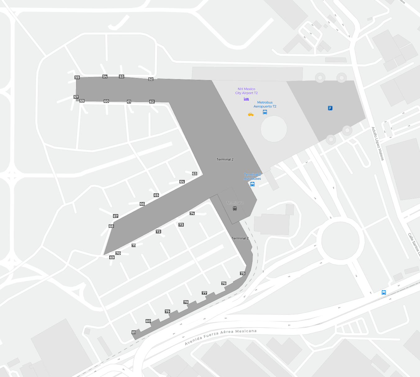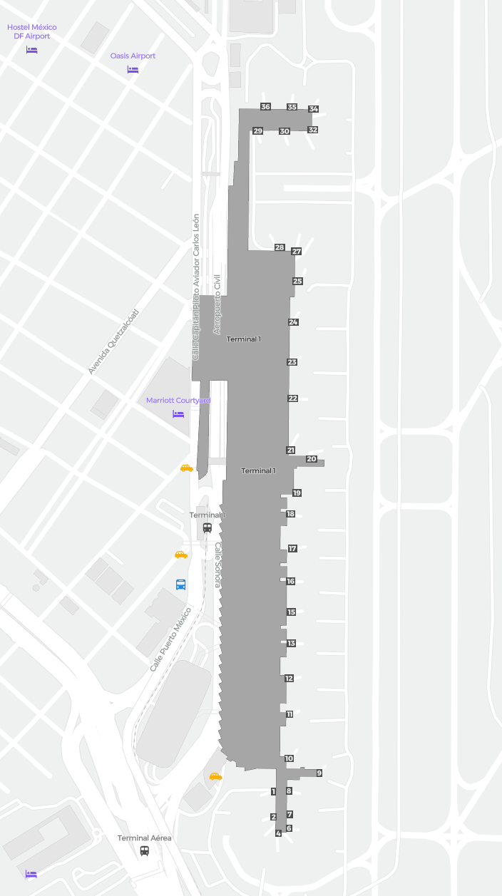Il s’agit d’une carte zoomable sur Mexico (MEX). La carte peut vous donner un aperçu de la zone extérieure avec les terminaux, parkings, et dans certains aéroports aussi des détails sur les portes, les agences de location de voitures et autres commodités si vous zoomez.