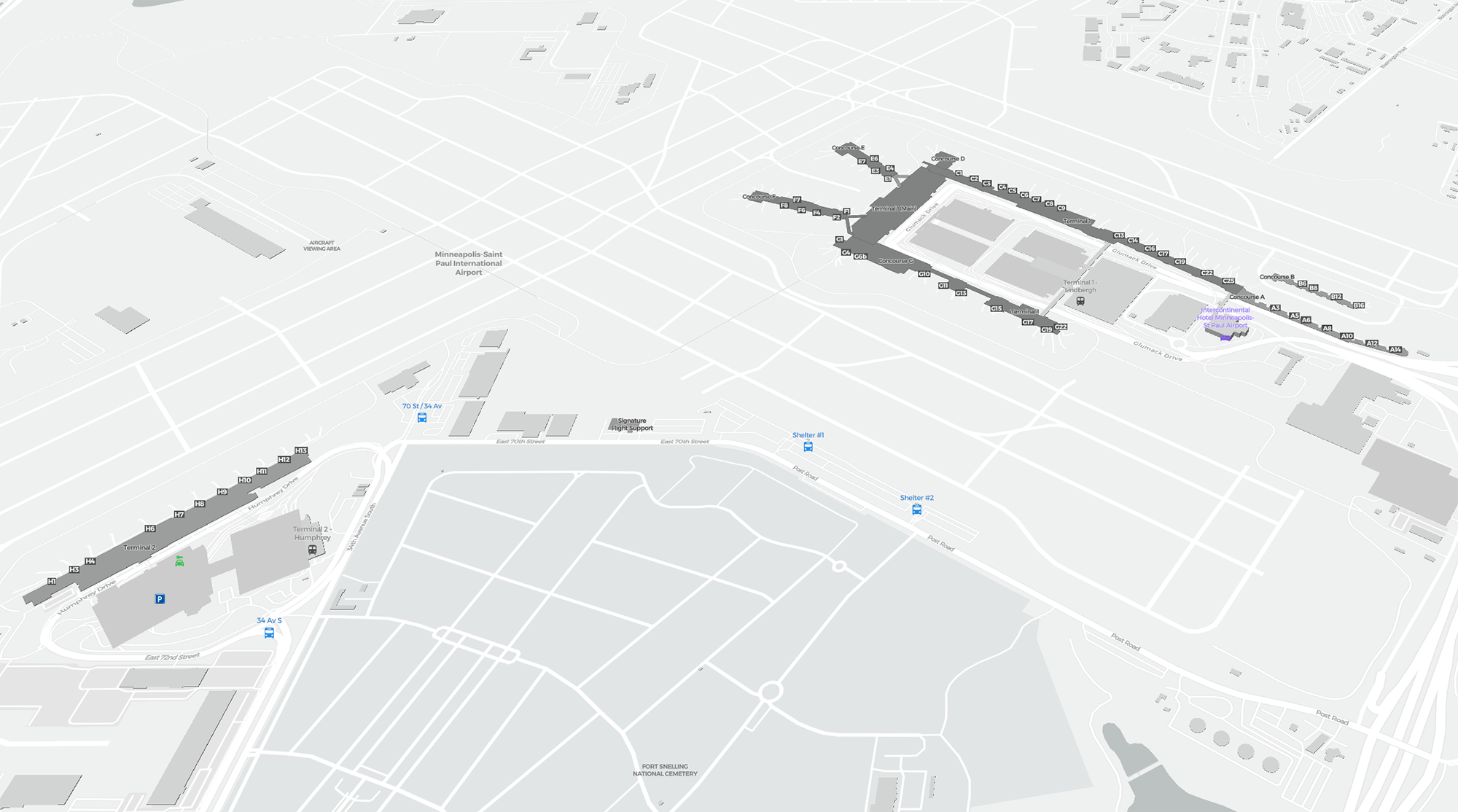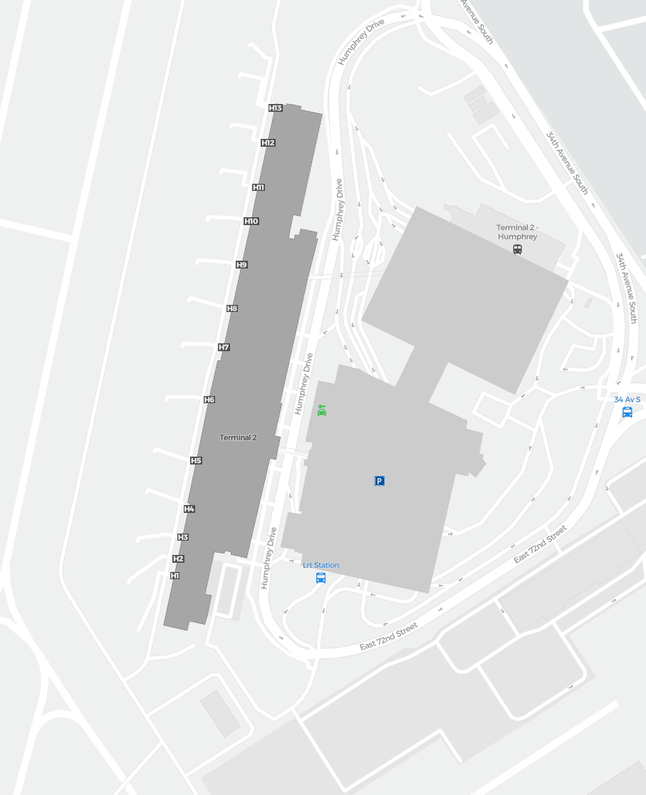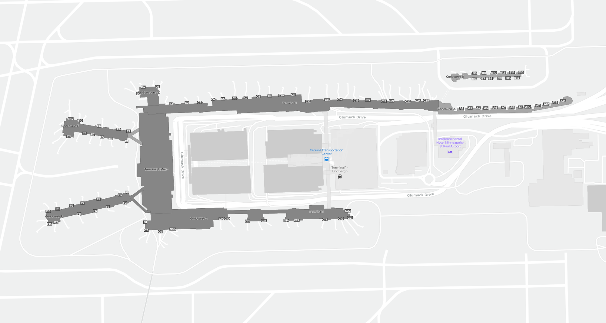 Il s’agit d’une carte zoomable sur Minneapolis (MSP). La carte peut vous donner un aperçu de la zone extérieure avec les terminaux, parkings, et dans certains aéroports aussi des détails sur les portes, les agences de location de voitures et autres commodités si vous zoomez.