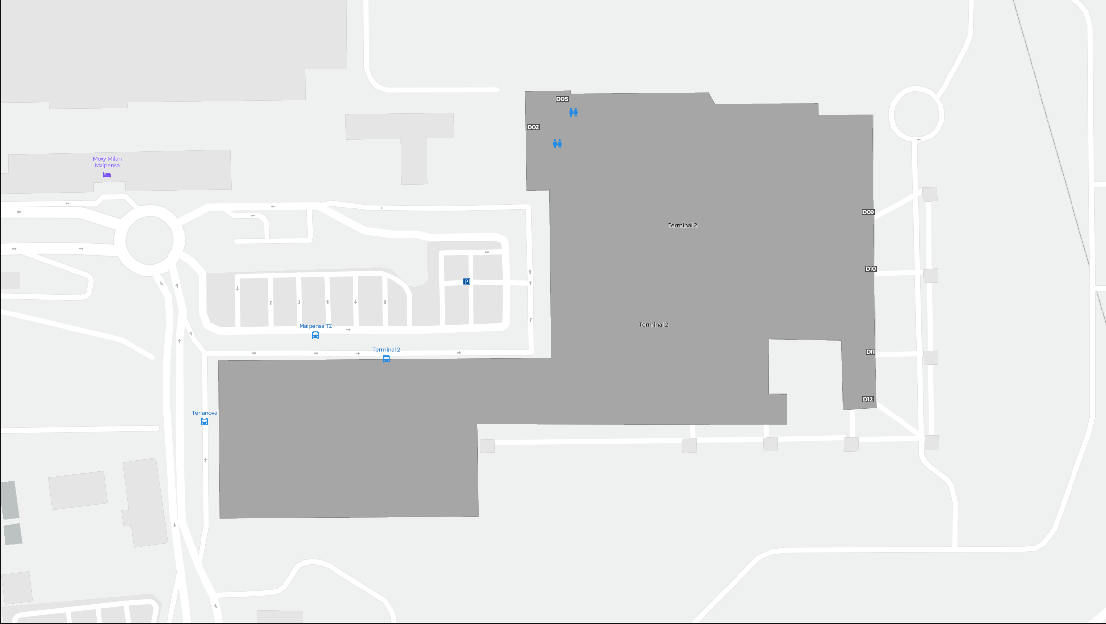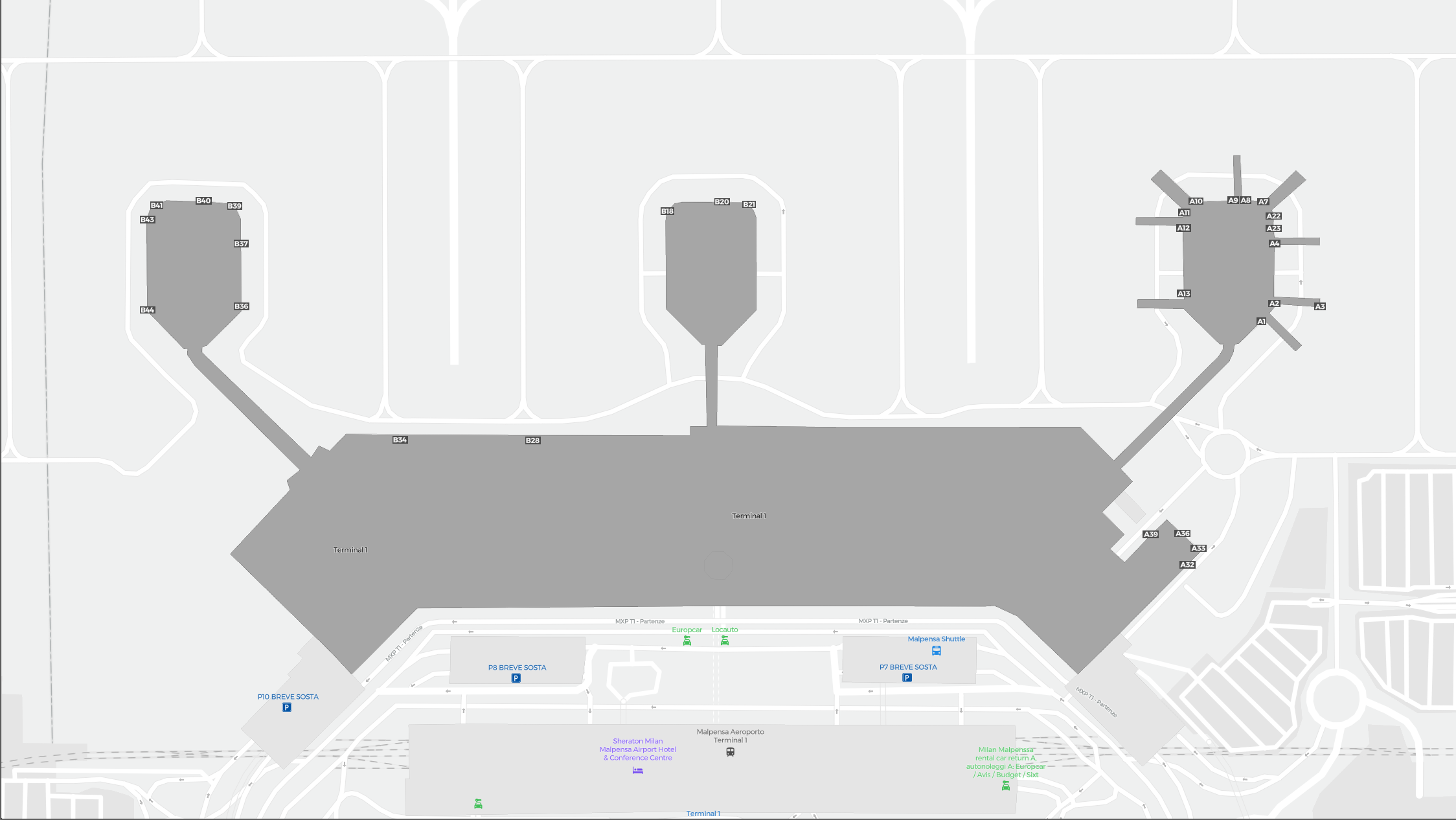 Il s’agit d’une carte zoomable sur Milan (MXP). La carte peut vous donner un aperçu de la zone extérieure avec les terminaux, parkings, et dans certains aéroports aussi des détails sur les portes, les agences de location de voitures et autres commodités si vous zoomez.