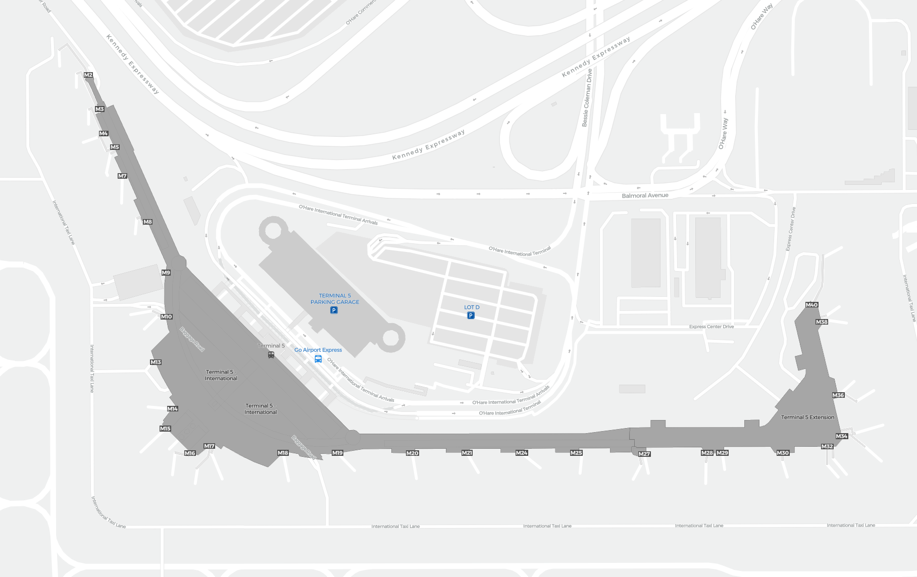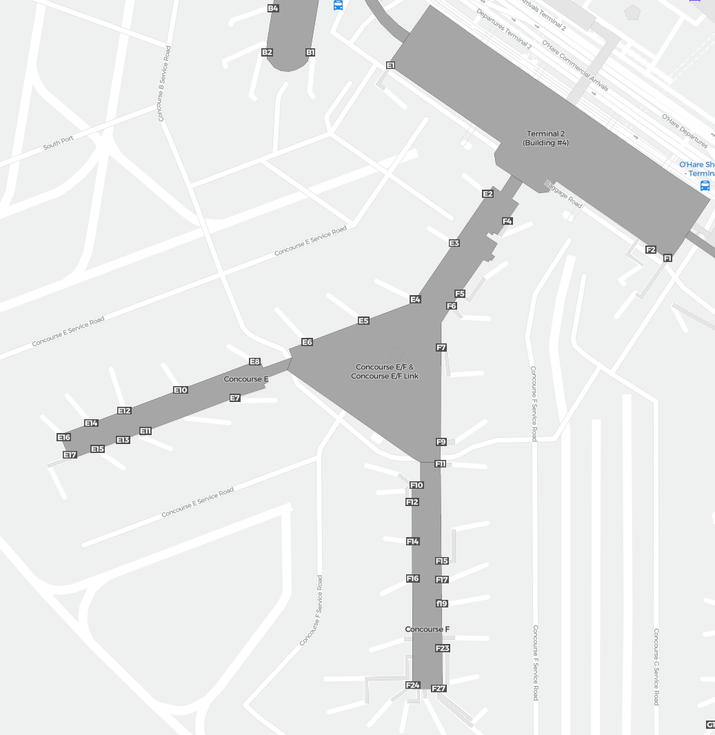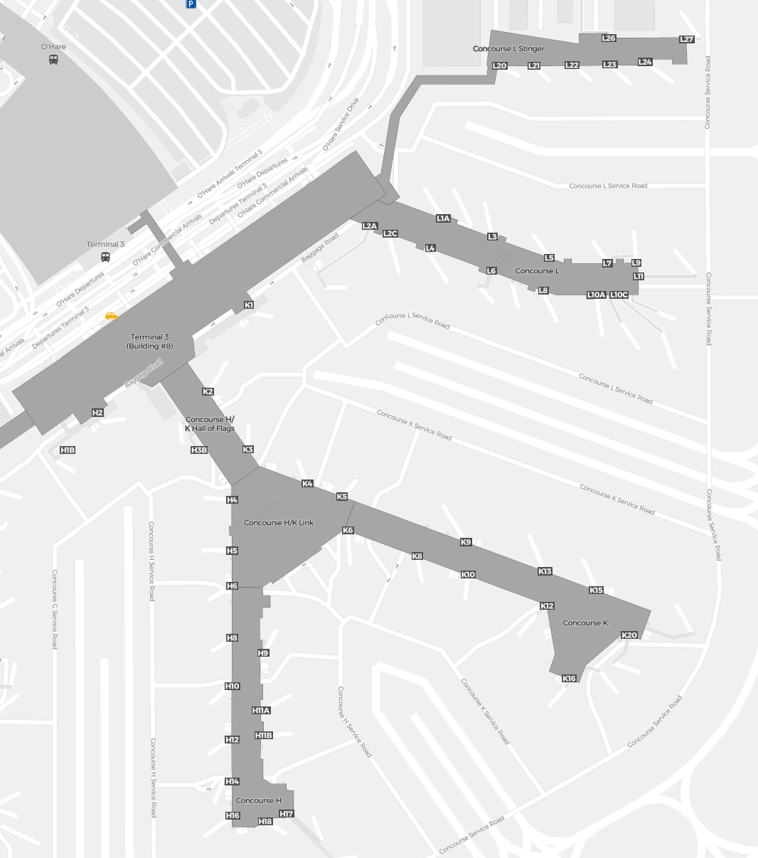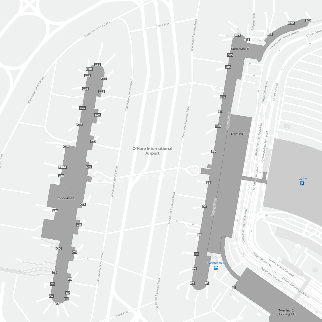 Il s’agit d’une carte zoomable sur Chicago (ORD). La carte peut vous donner un aperçu de la zone extérieure avec les terminaux, parkings, et dans certains aéroports aussi des détails sur les portes, les agences de location de voitures et autres commodités si vous zoomez.