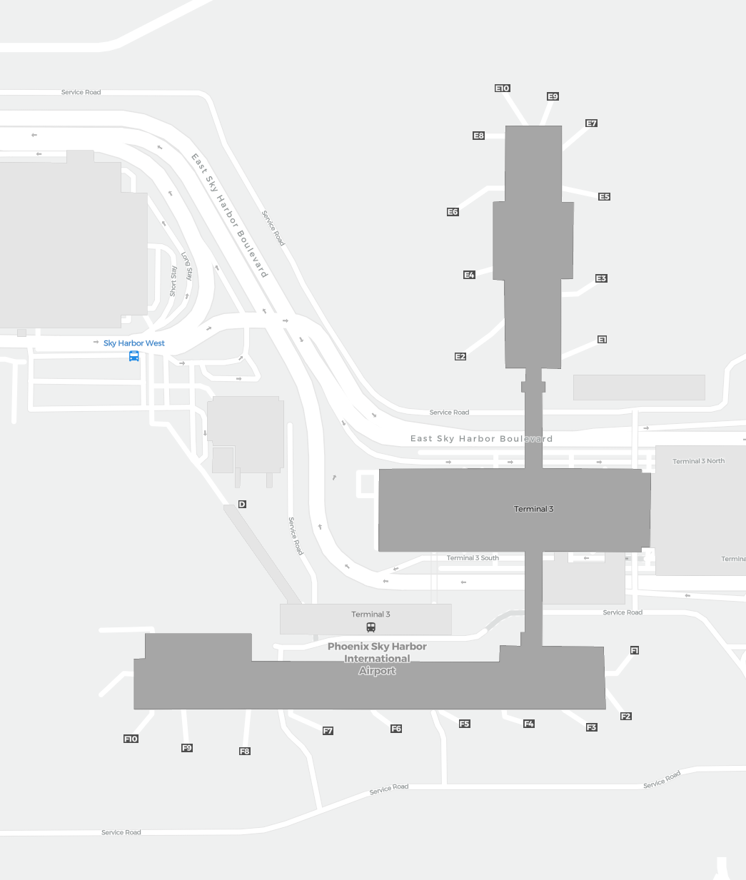 Il s’agit d’une carte zoomable sur Phoenix (PHX). La carte peut vous donner un aperçu de la zone extérieure avec les terminaux, parkings, et dans certains aéroports aussi des détails sur les portes, les agences de location de voitures et autres commodités si vous zoomez.