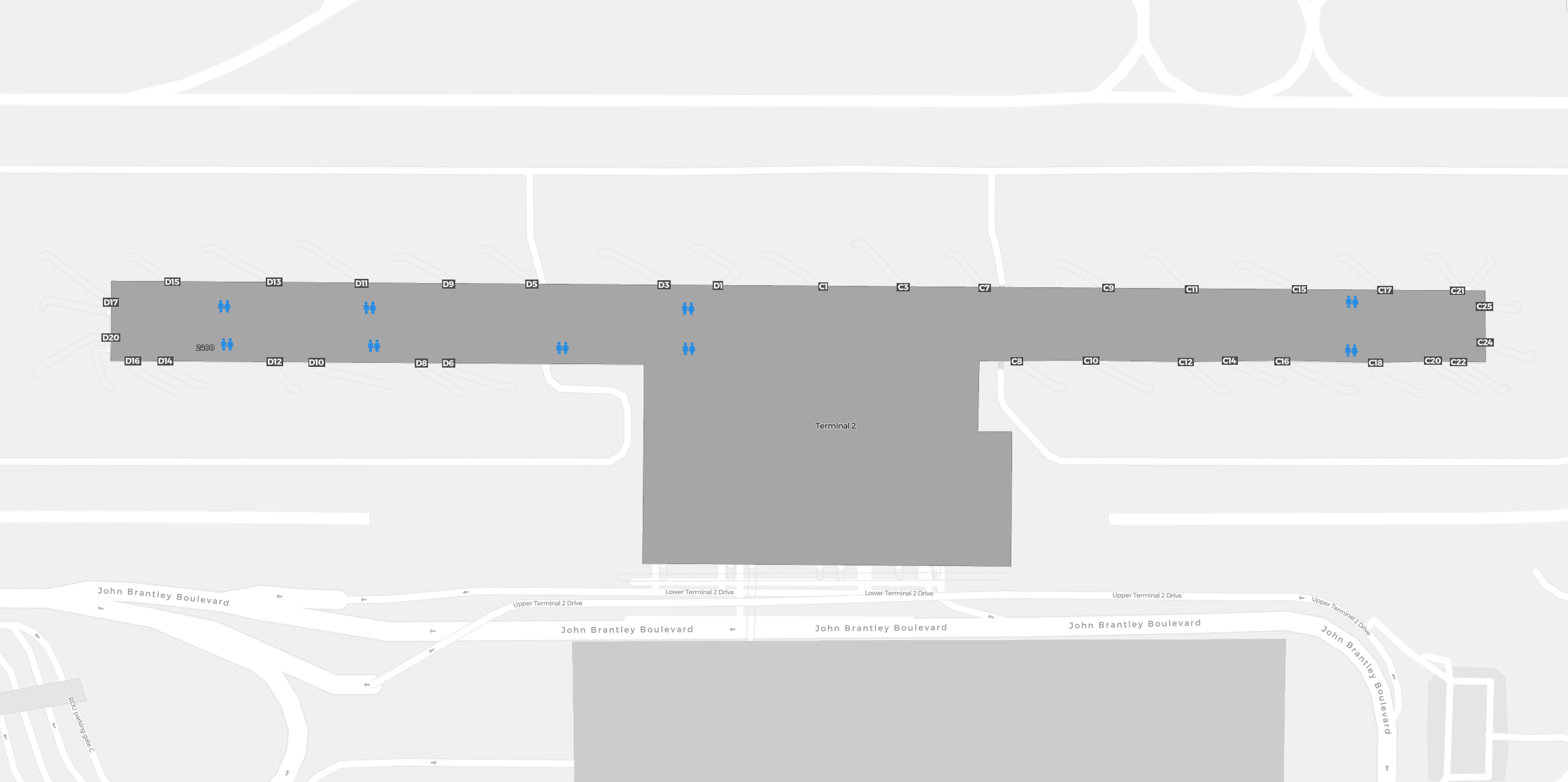 Il s’agit d’une carte zoomable sur Raleigh (RDU). La carte peut vous donner un aperçu de la zone extérieure avec les terminaux, parkings, et dans certains aéroports aussi des détails sur les portes, les agences de location de voitures et autres commodités si vous zoomez.