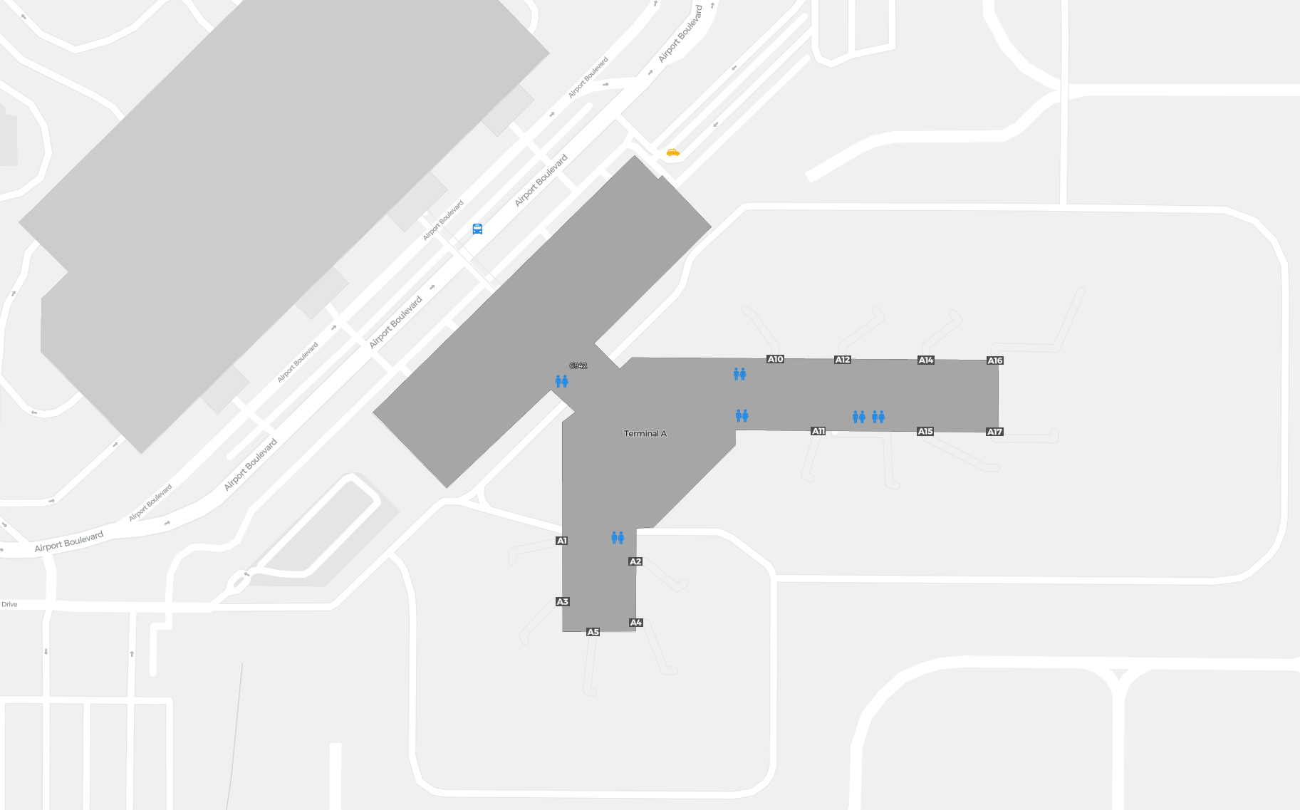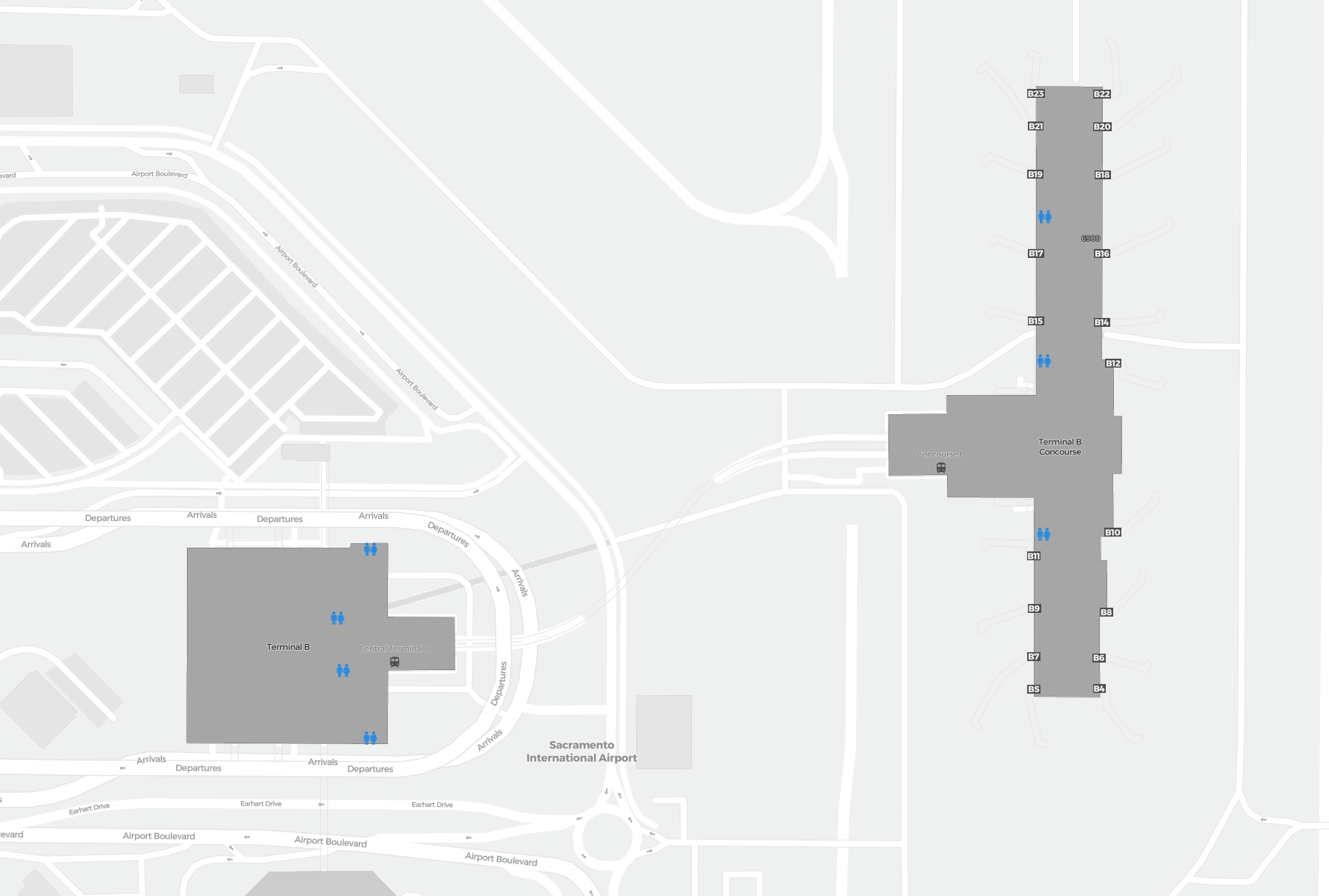 Il s’agit d’une carte zoomable sur Sacramento (SMF). La carte peut vous donner un aperçu de la zone extérieure avec les terminaux, parkings, et dans certains aéroports des détails sur les portes, les agences de location de voitures et autres commodités si vous zoomez.