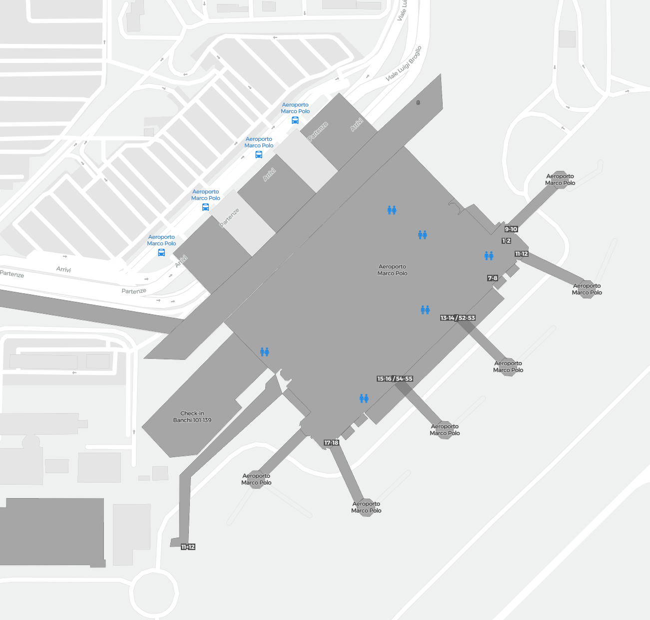 Il s’agit d’une carte zoomable sur Venise (VCE). La carte peut vous donner un aperçu de la zone extérieure avec les terminaux, parkings, et dans certains aéroports aussi des détails sur les portes, les agences de location de voitures et autres commodités si vous zoomez.